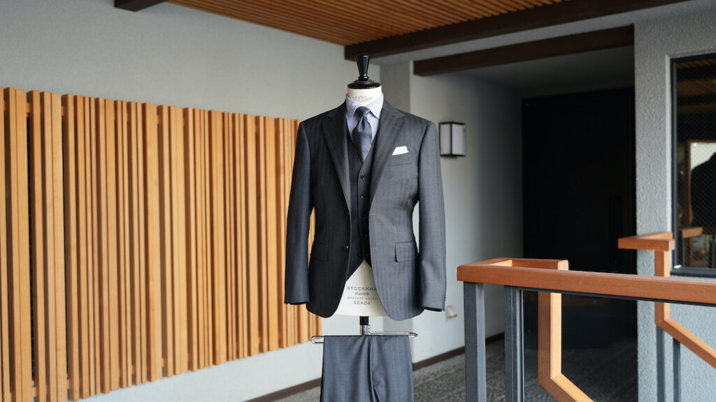 シングル2つボタンのスリーピースにてご注文いただきました。