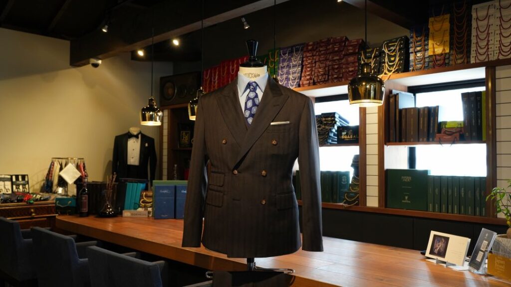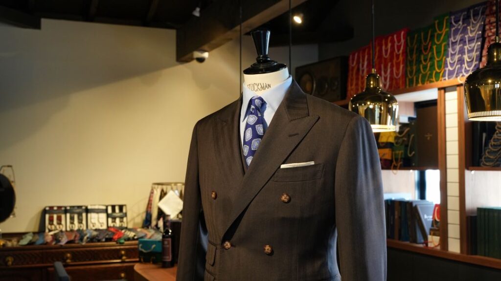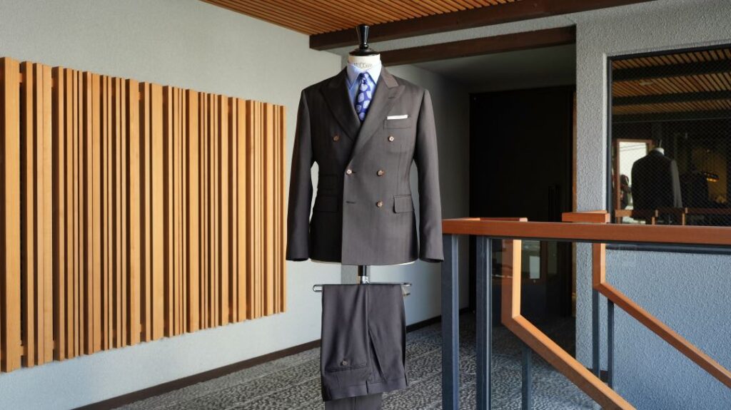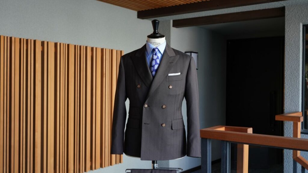 ダブル6×2ボタンのスリーピーススーツにてご注文いただきました。