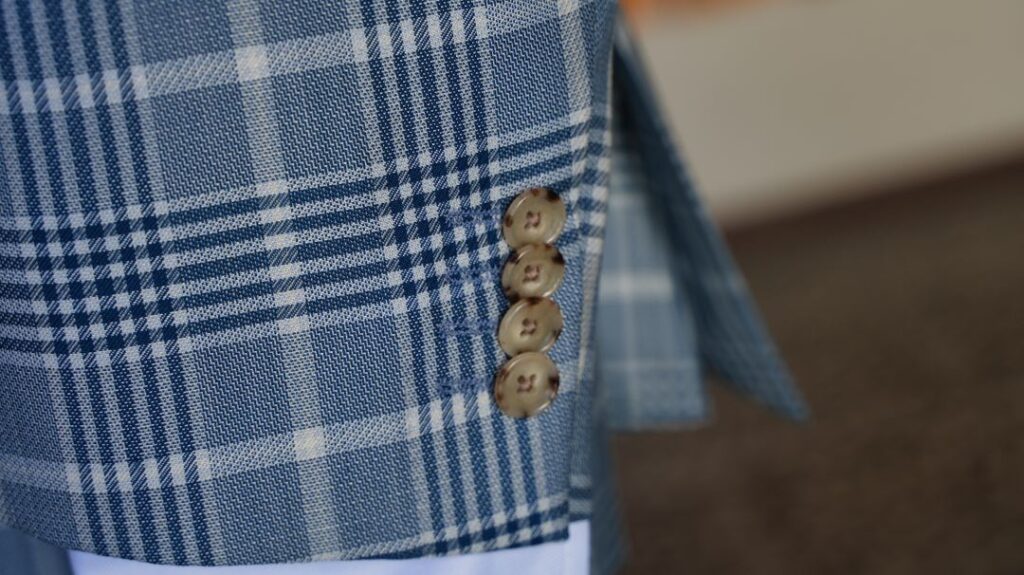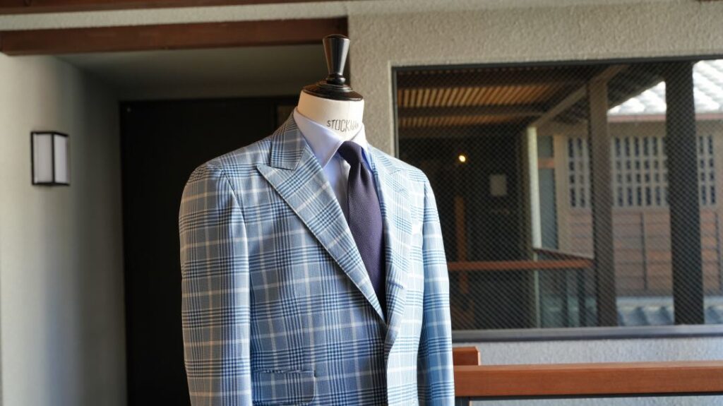 シングル3ボタン段返りのスーツにてご注文いただきました。