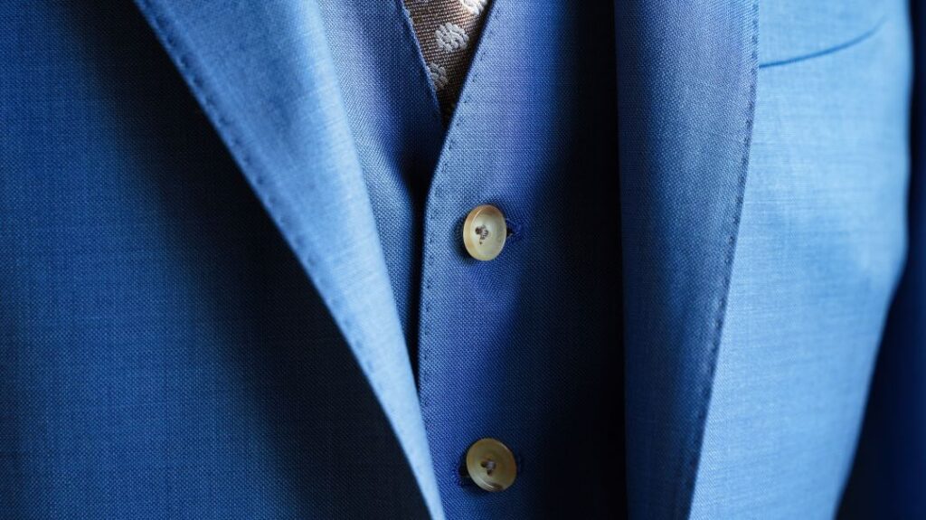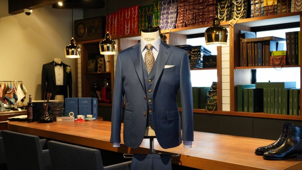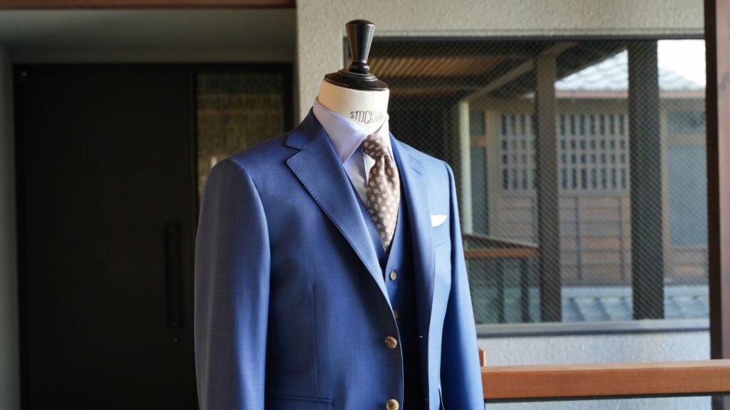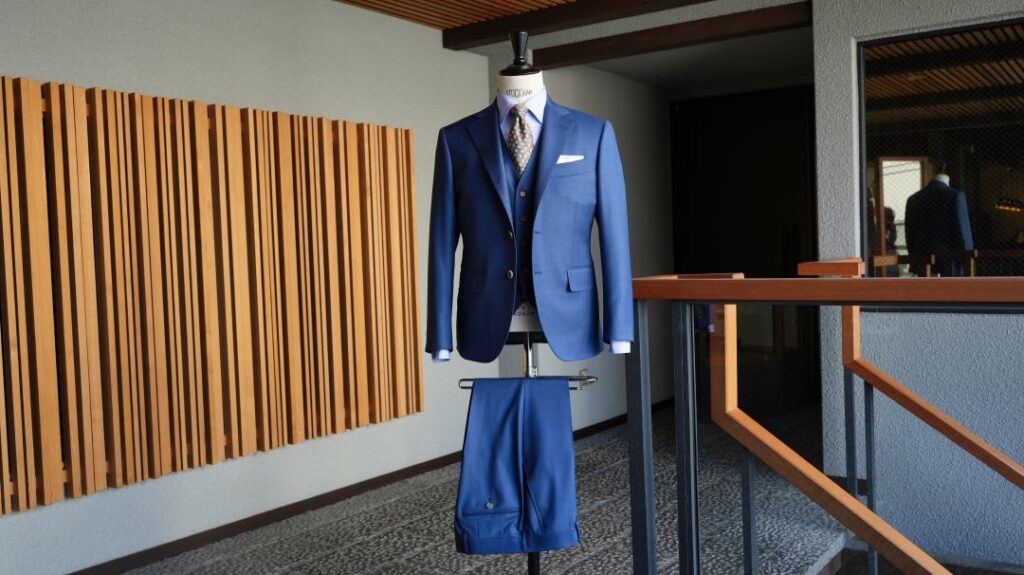 シングル2つボタンのスリーピーススーツにてご注文いただきました。