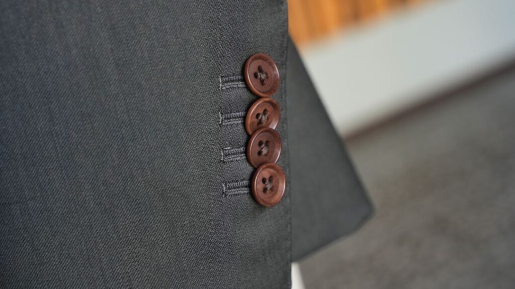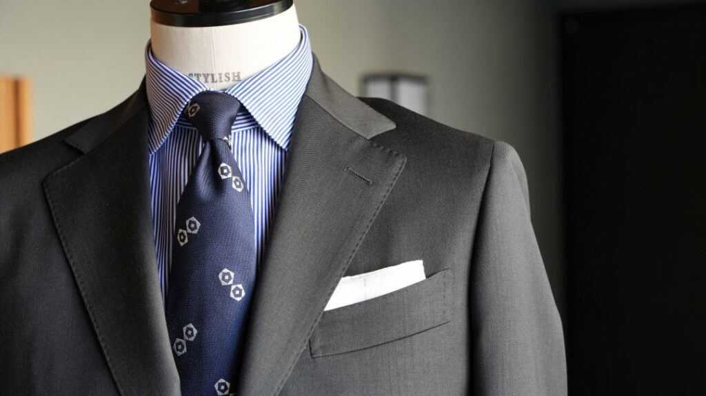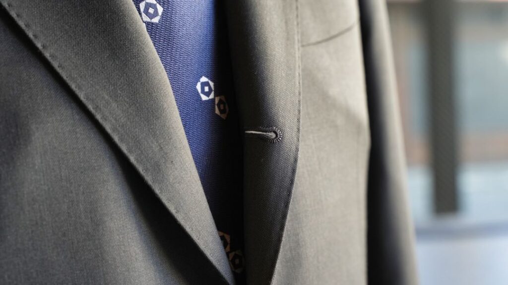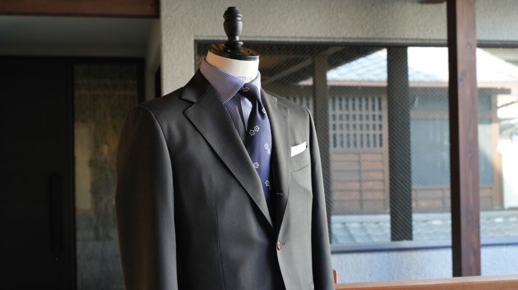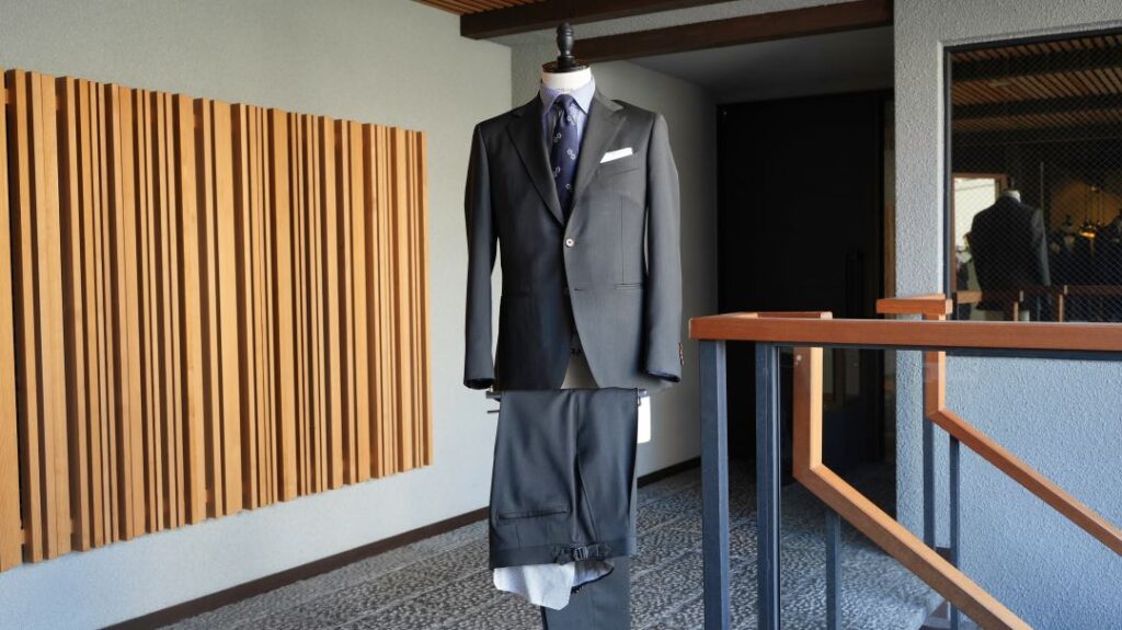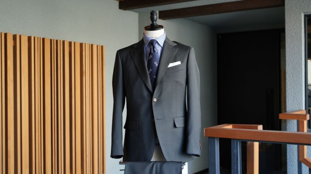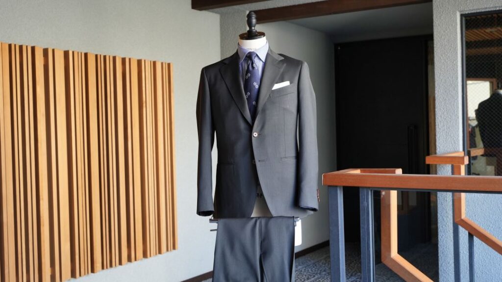 シングル3つボタン段返りのスーツにてご注文いただきました。