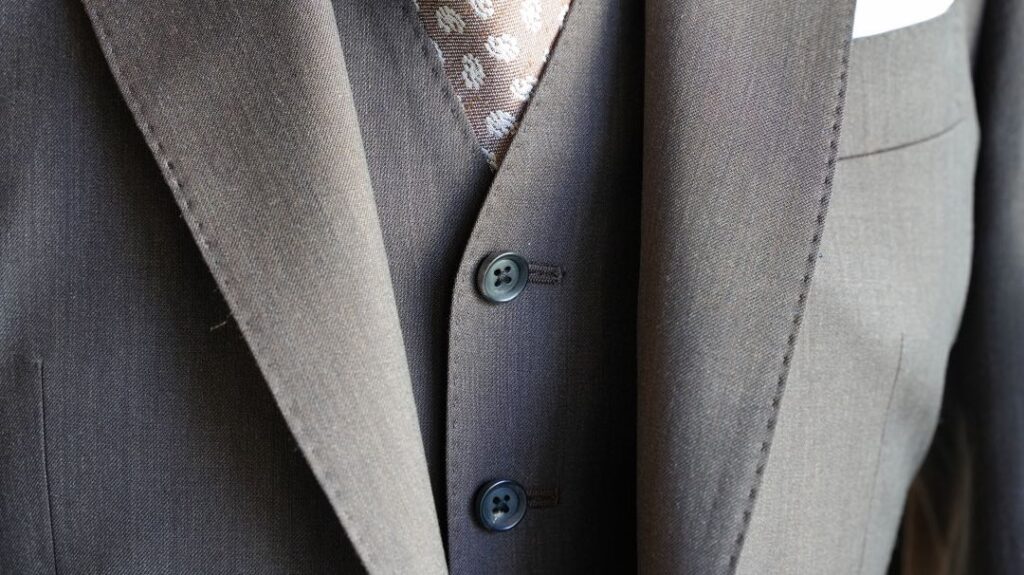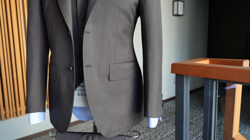 シングル2つボタンのスリーピーススーツにてご注文いただきました。