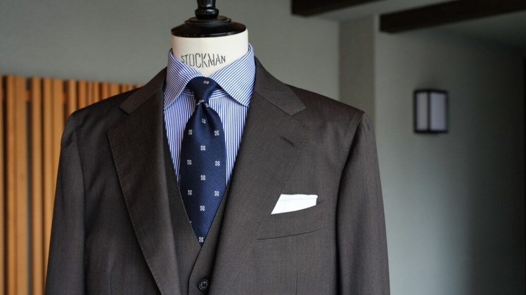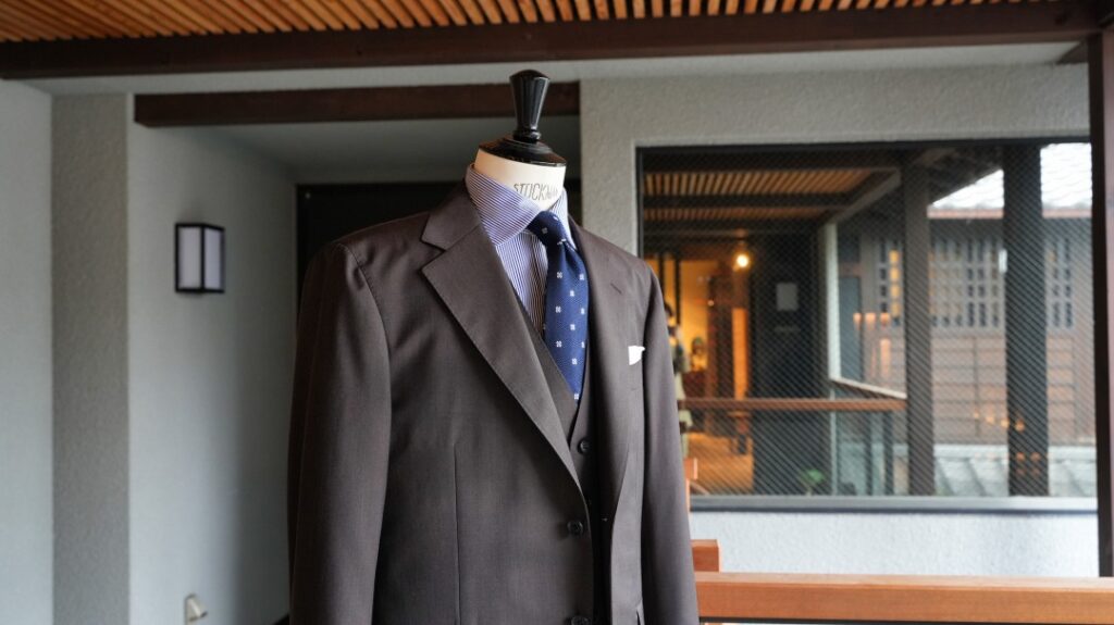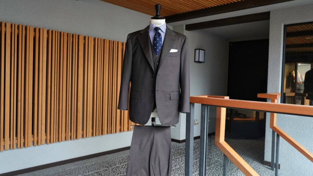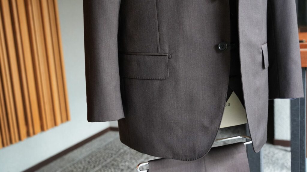 シングル2つボタンのスリーピーススーツにてご注文いただきました。