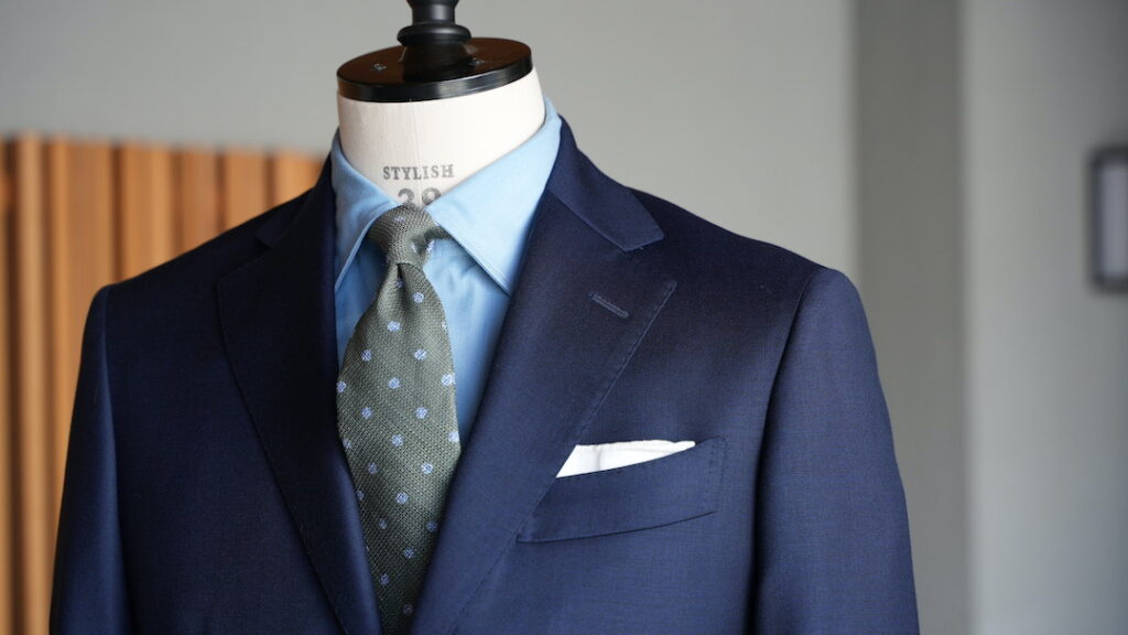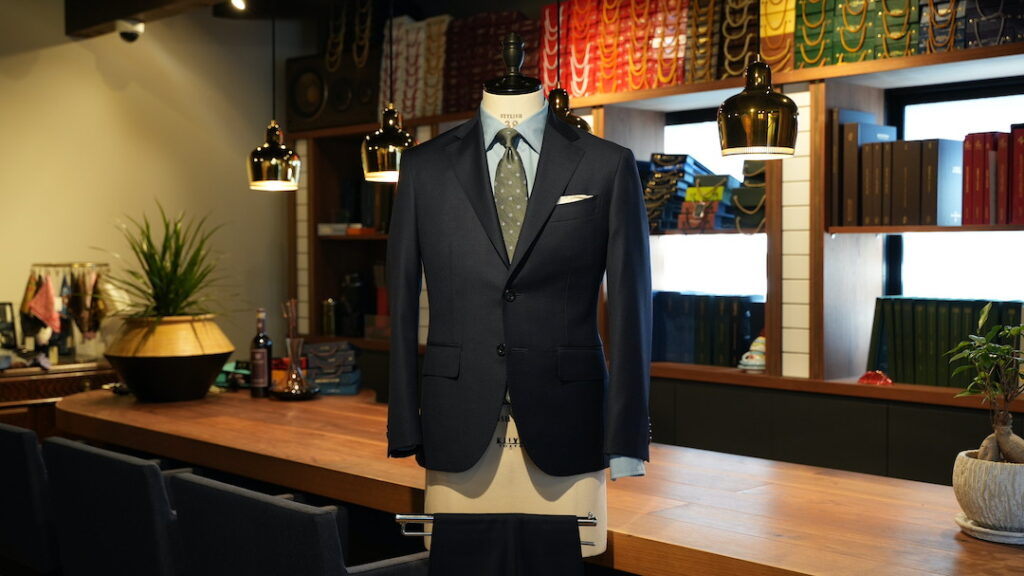 光沢感のある無地ネイビーに裏地にオーダーならではのアソビを