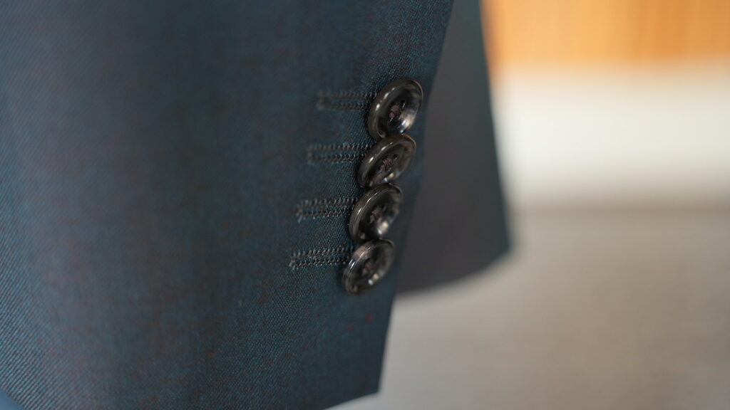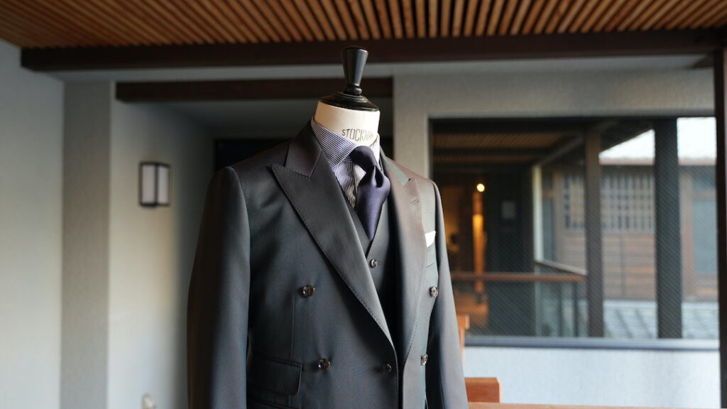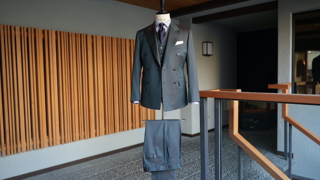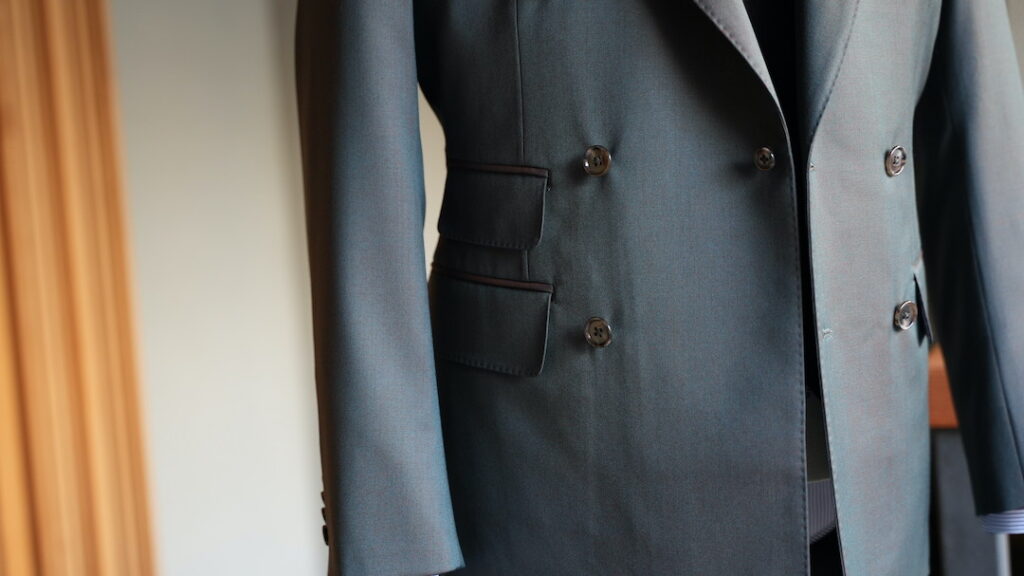 ダブル6×2ボタンのスリーピーススーツにてご注文いただきました。