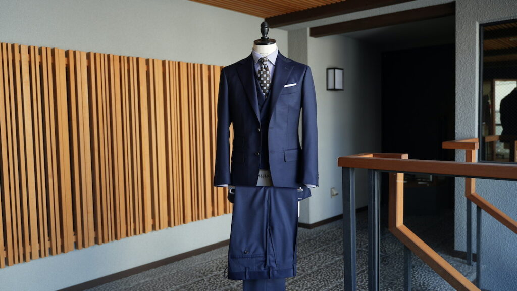 シングル2ボタンのスリーピーススーツにてご注文いただきました。