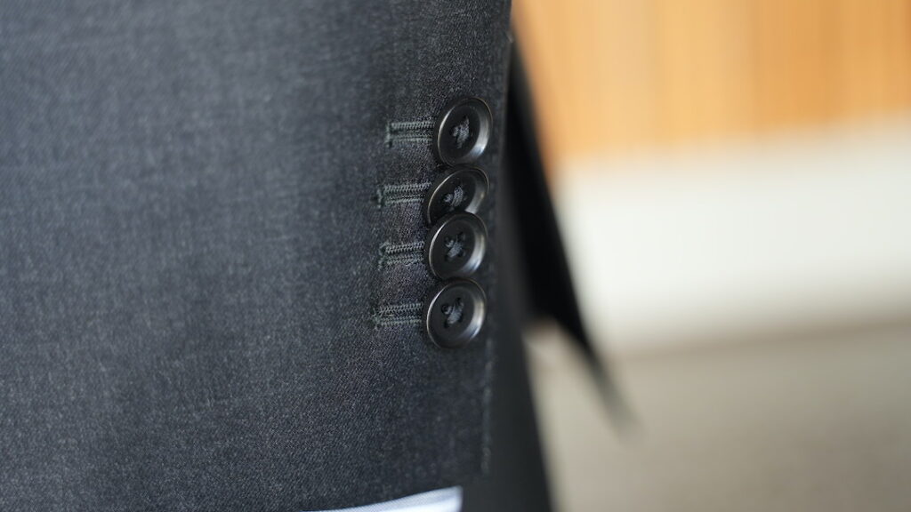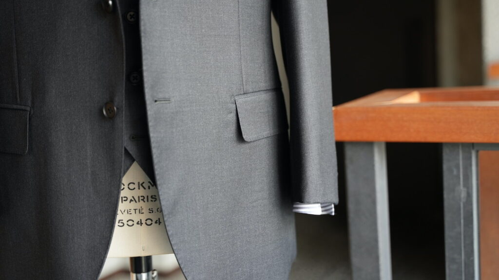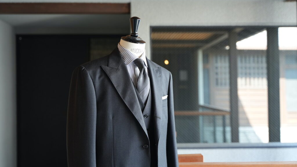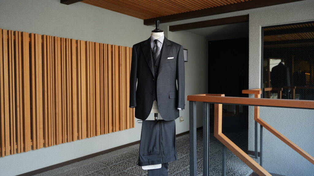 シングル3ボタン段返りのスリーピーススーツにてご注文いただきました。