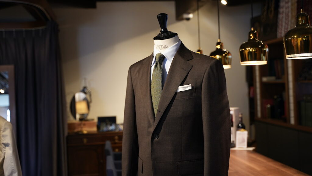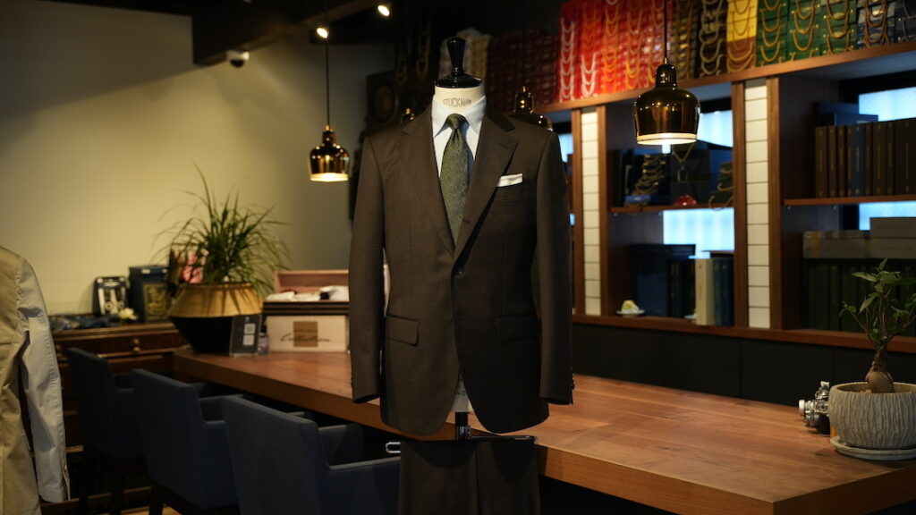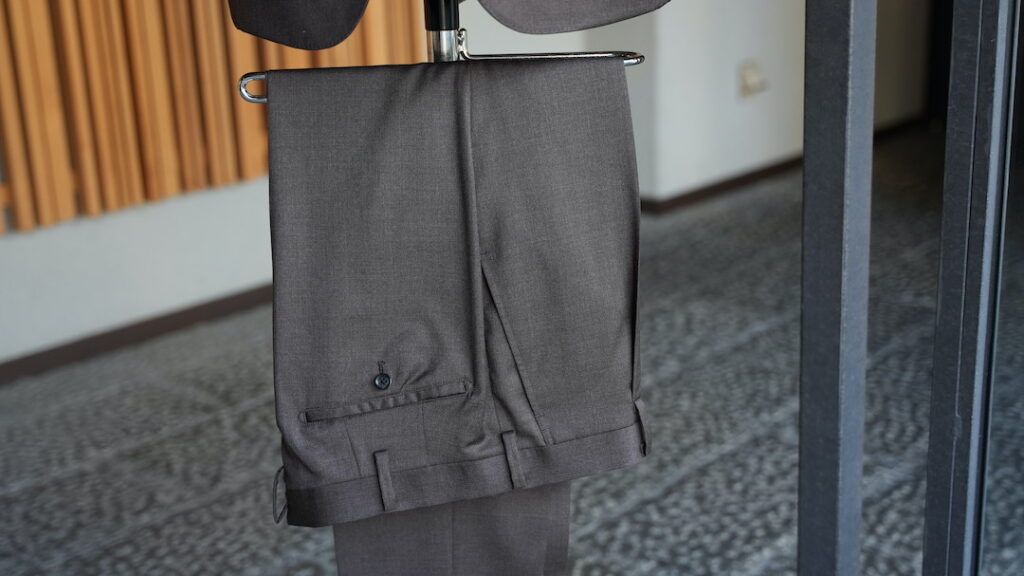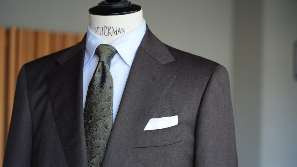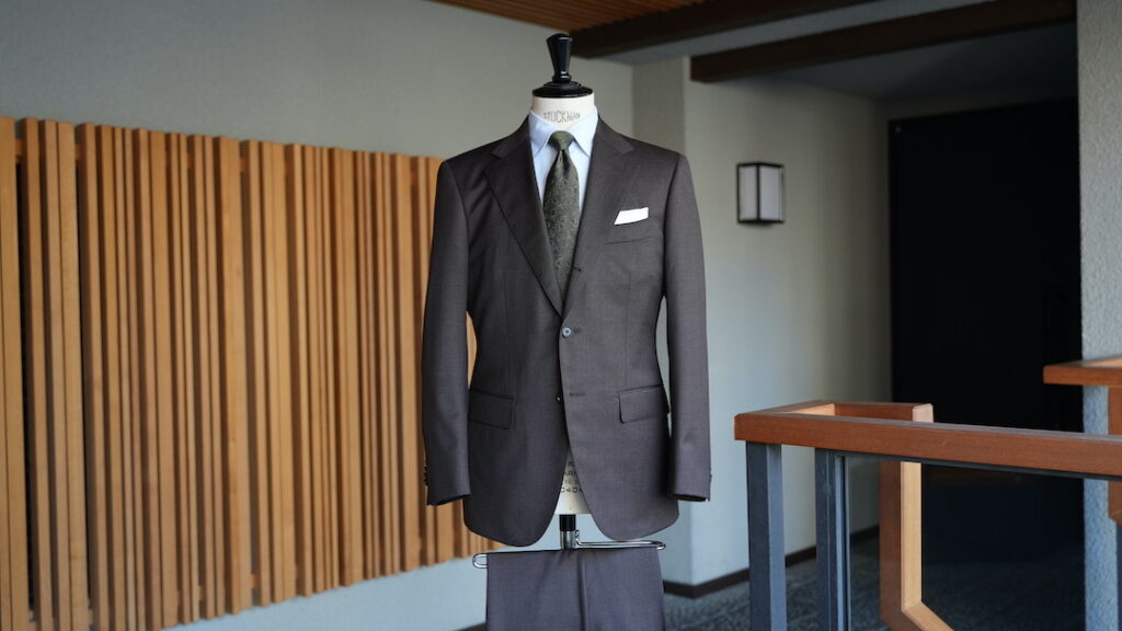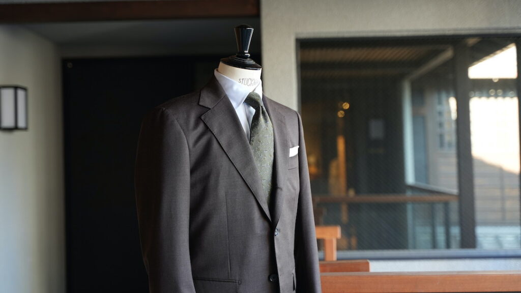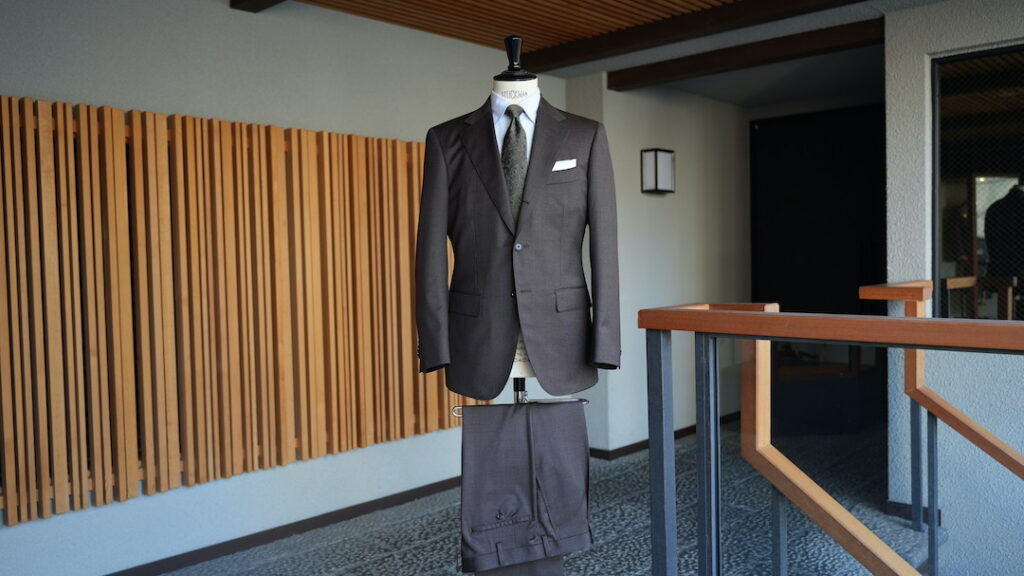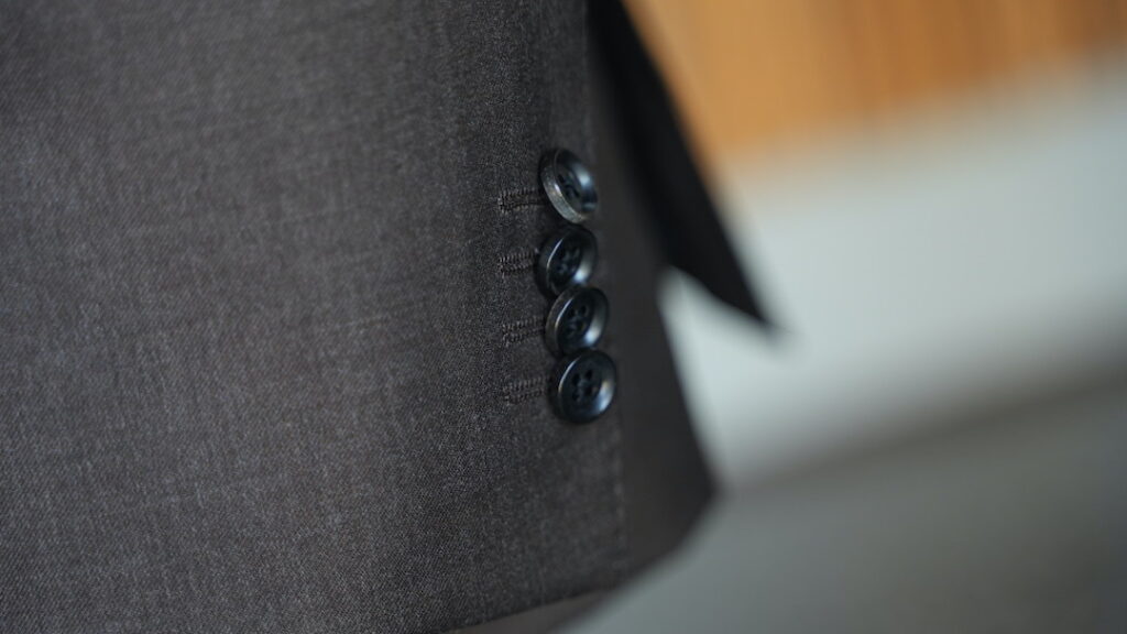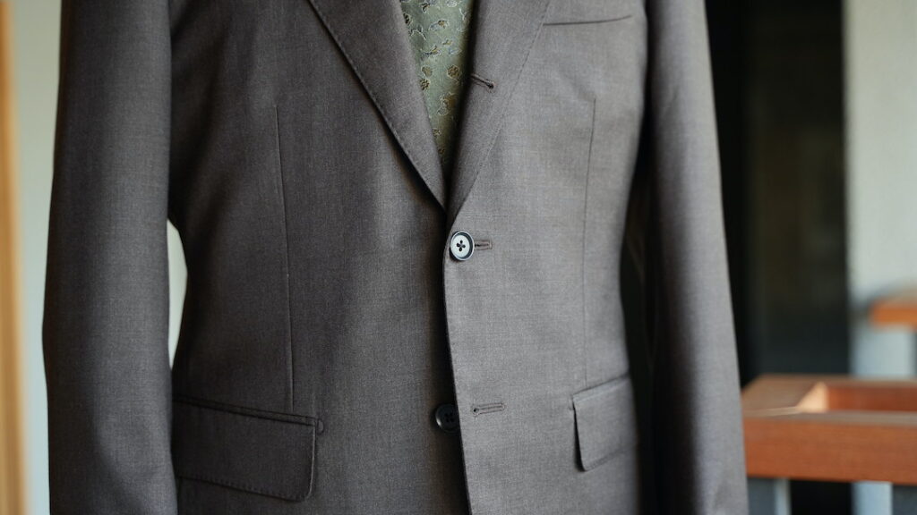 シングル3ボタン段返りのスーツにてご注文いただきました。