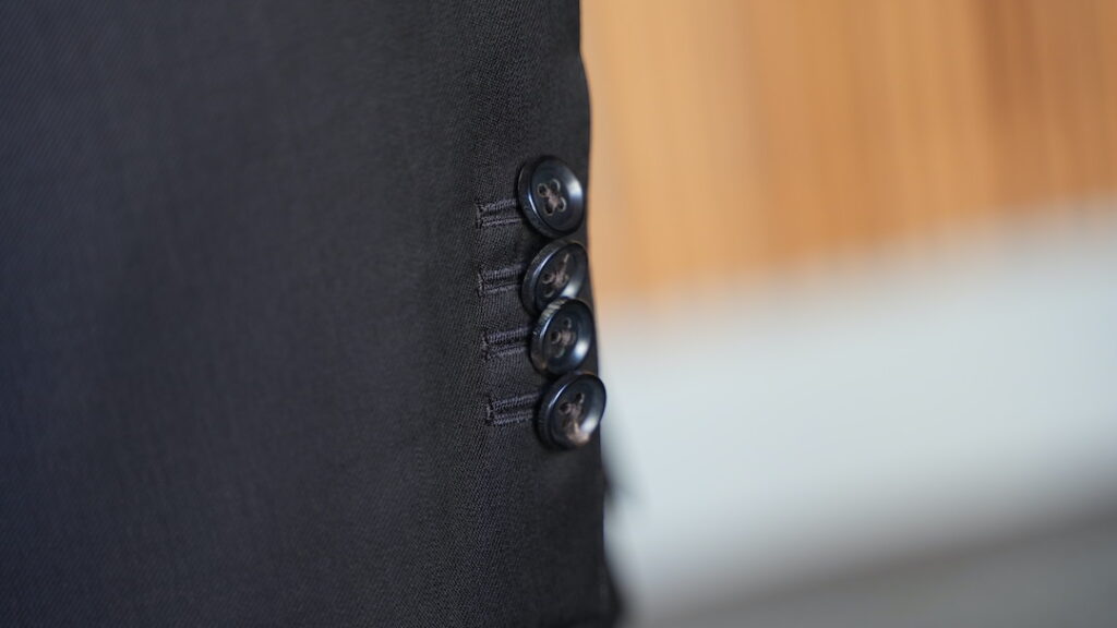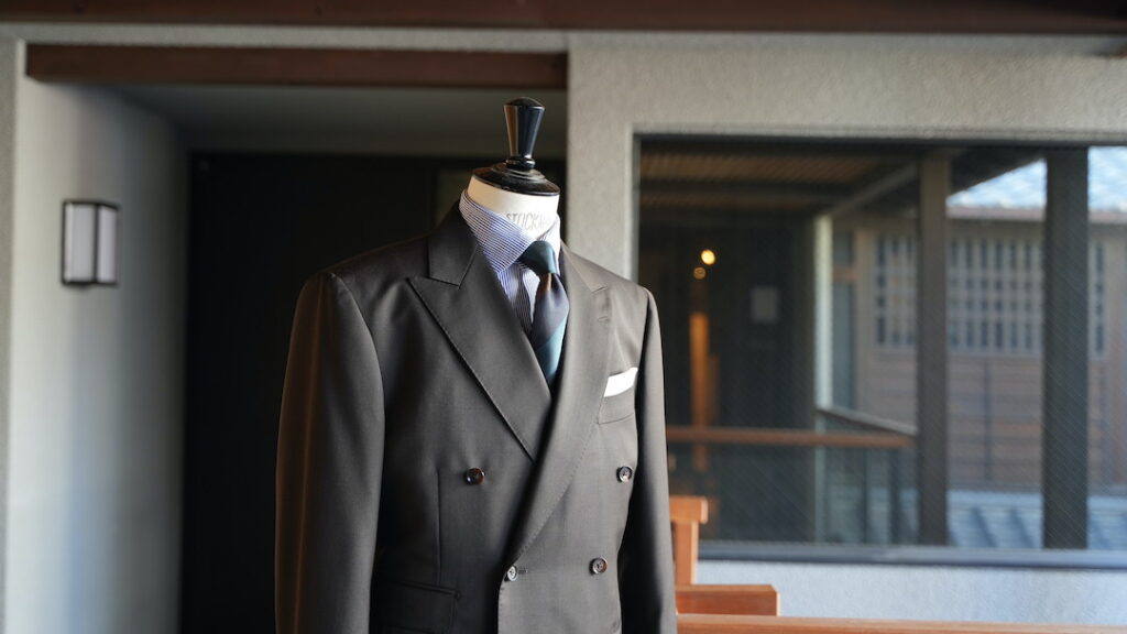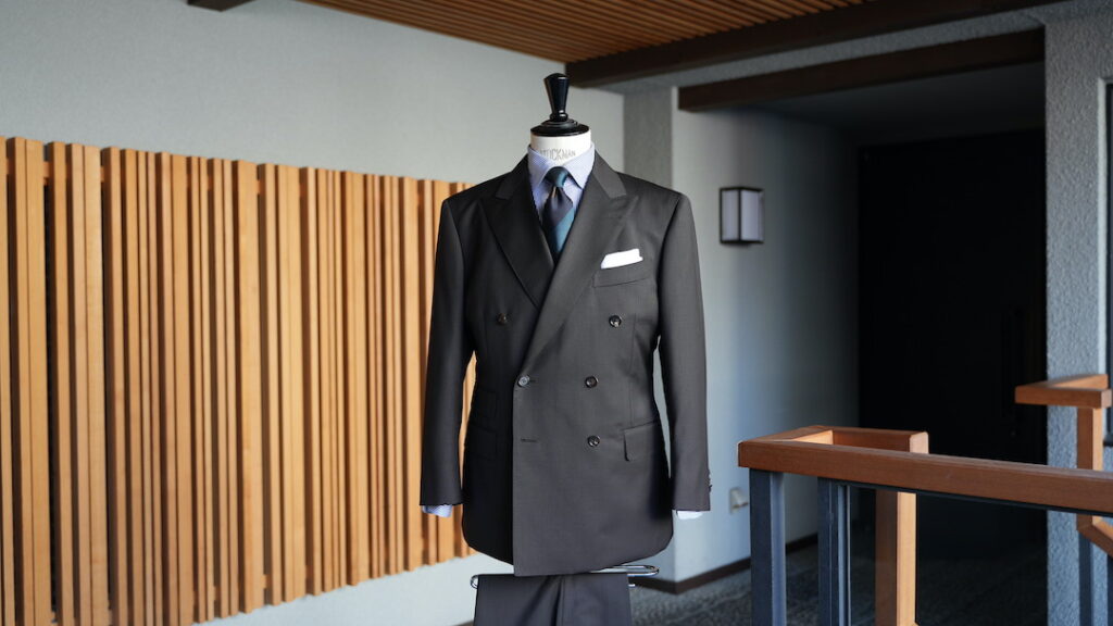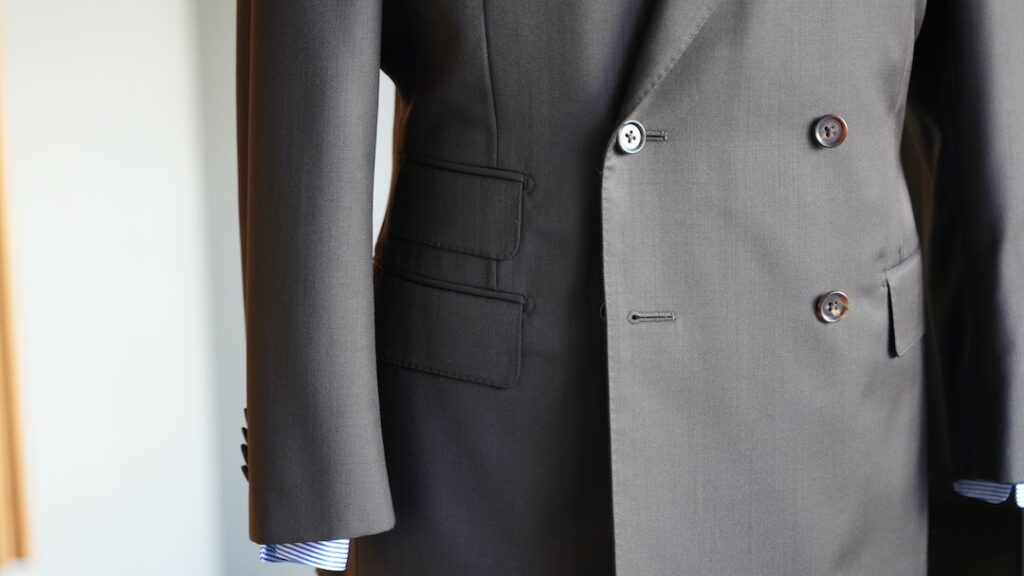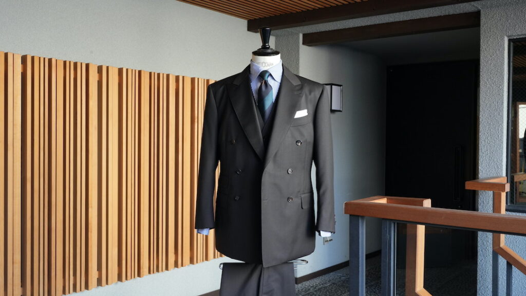 ダブル6×2ボタンのスリーピーススーツにてご注文いただきました。