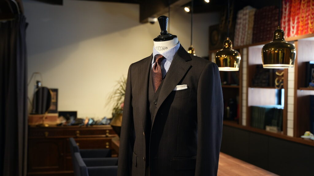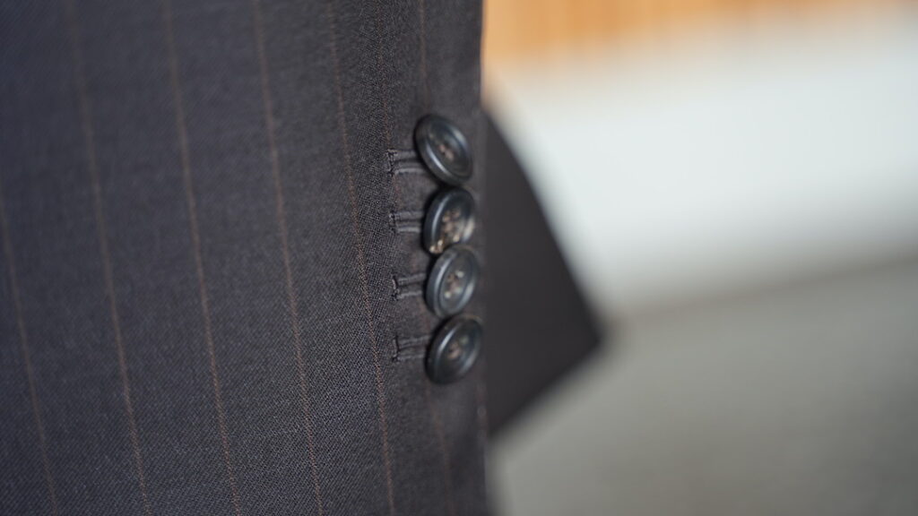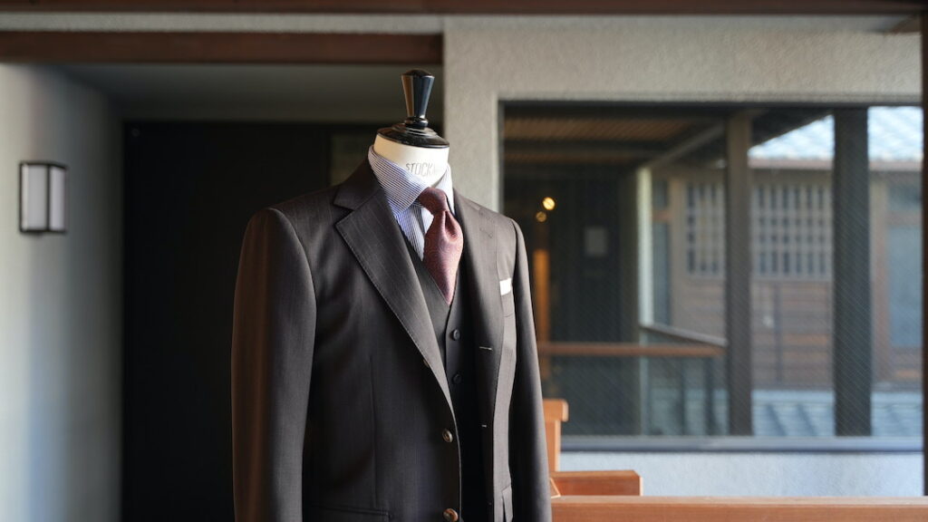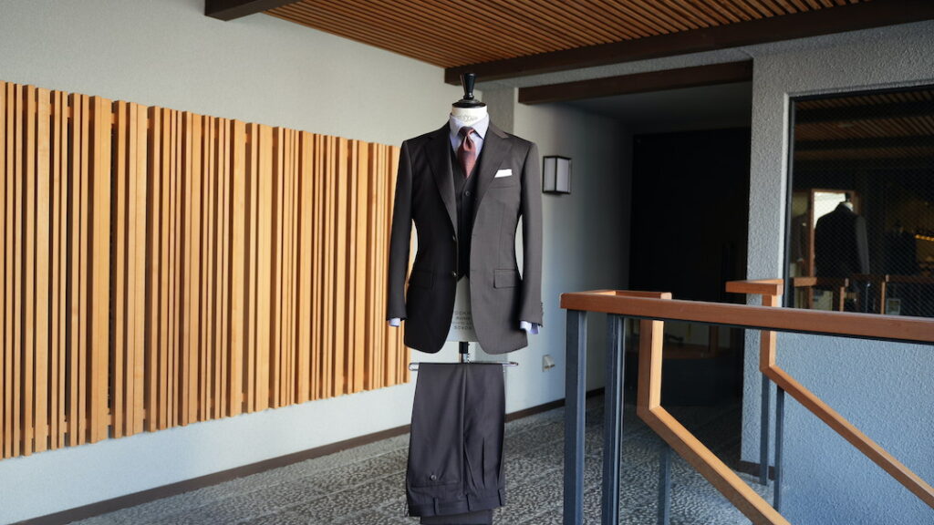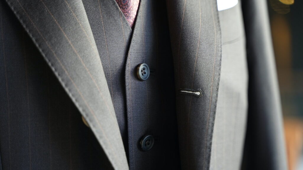 シングル3ボタン段返りのスリーピーススーツにてご注文いただきました。
