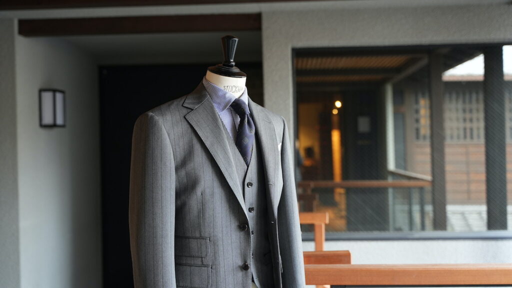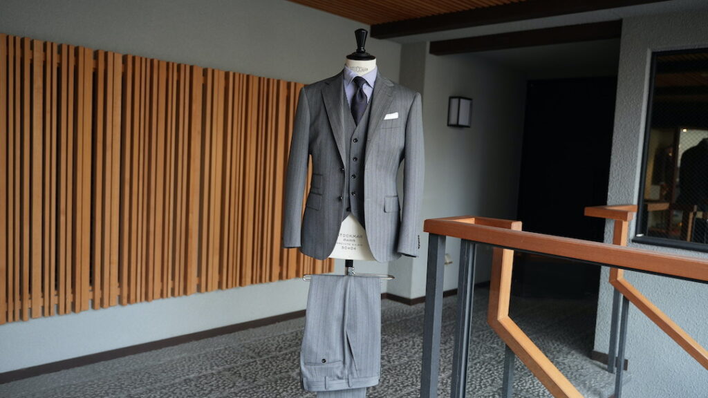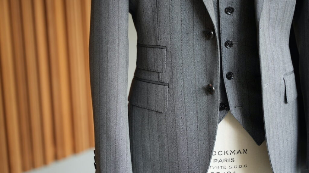 シングル3ボタン段返りのスリーピーススーツにてご注文いただきました。