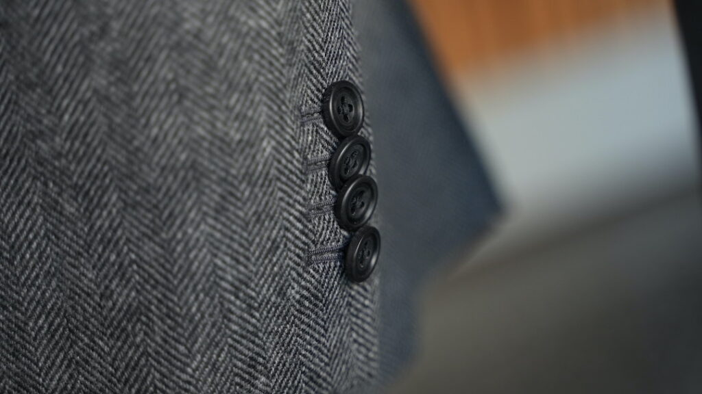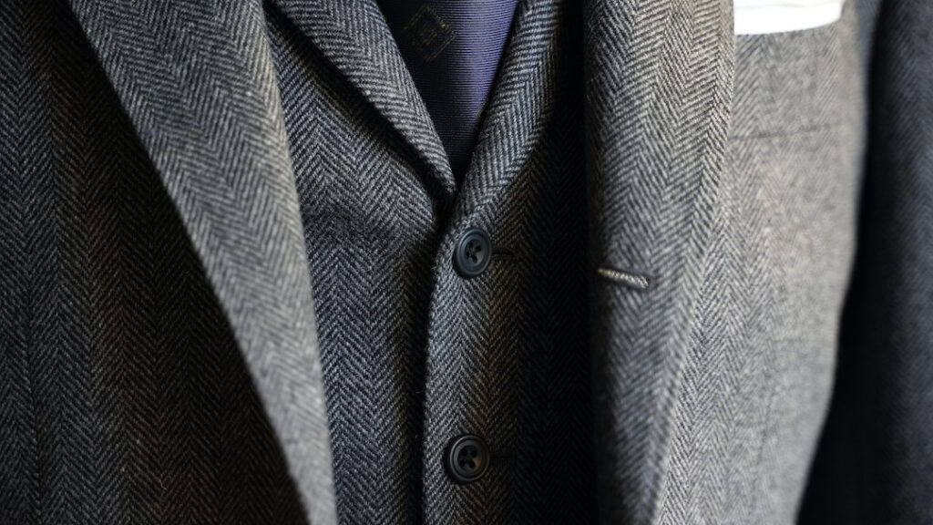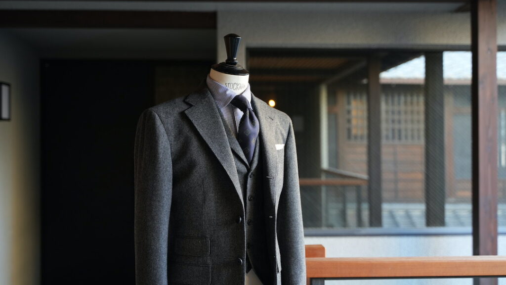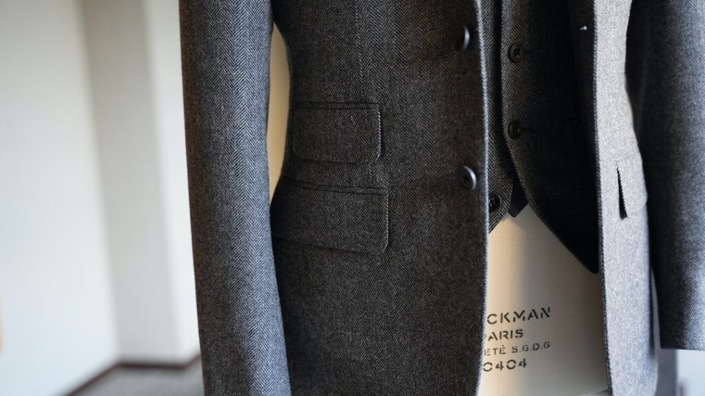 シングル3ボタン段返りのスリーピーススーツにてご注文いただきました。