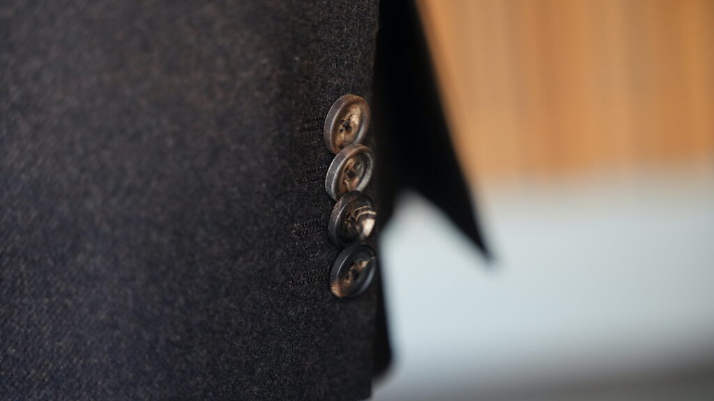 シングル3ボタン段返りのスーツにてご注文いただきました。