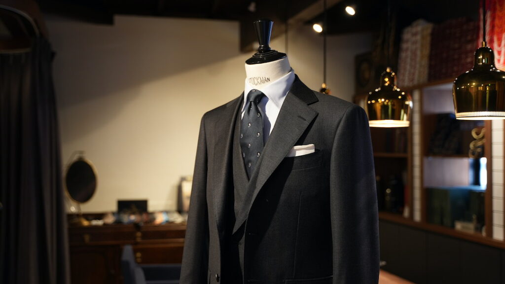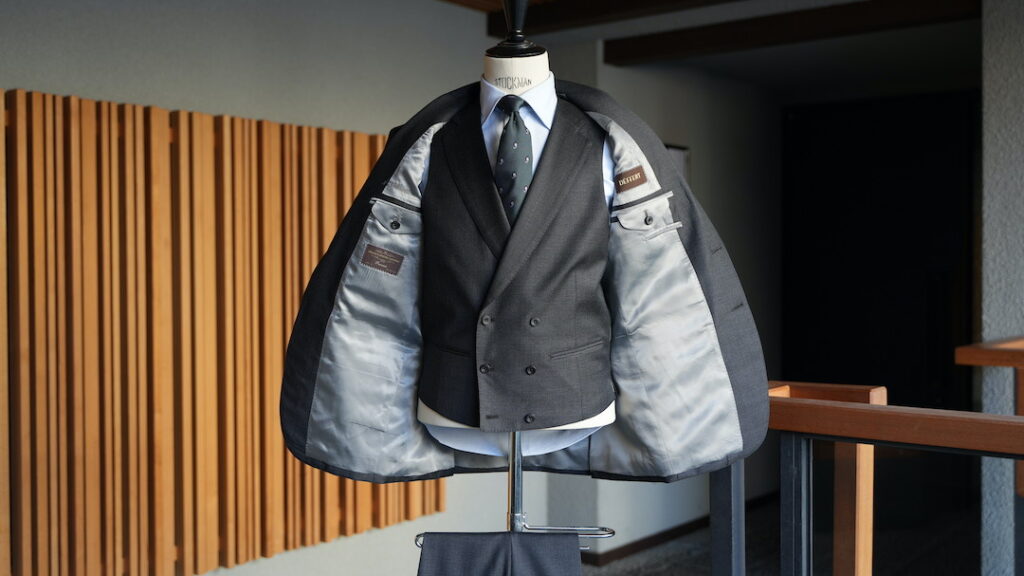 シングル3つボタン段返りのスリーピーススーツにてご注文いただきました。