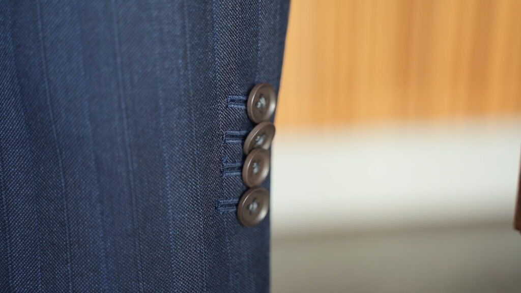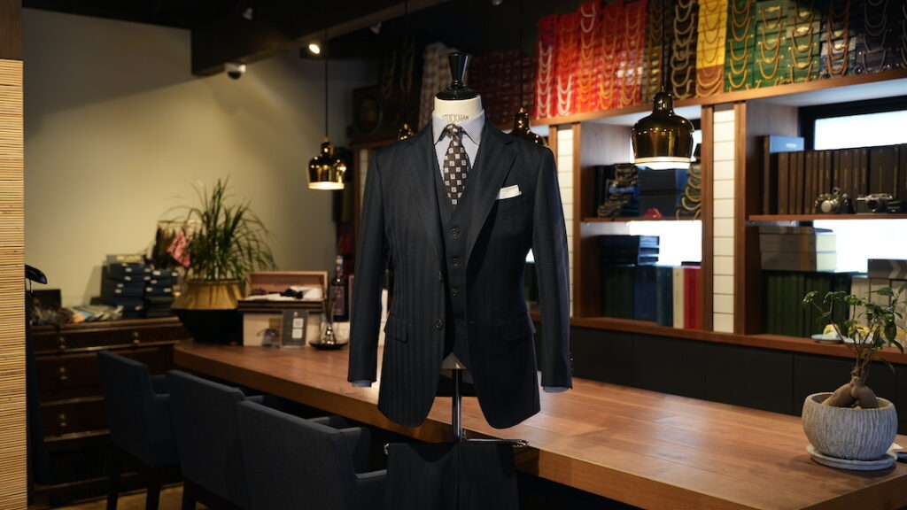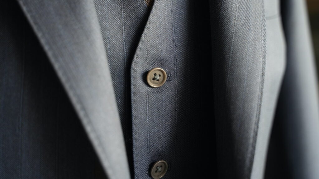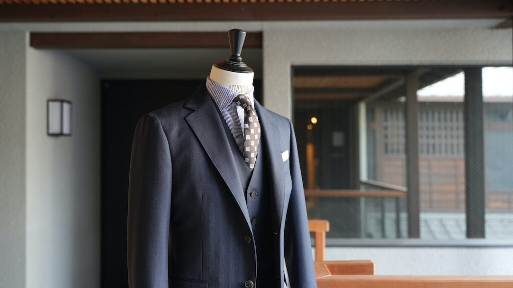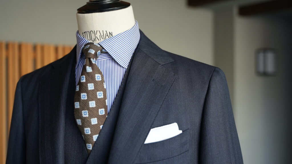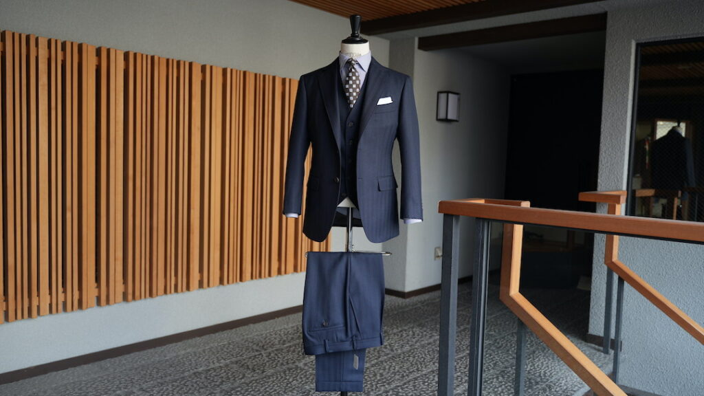 シングル2つボタンのスリーピーススーツにてご注文いただきました。