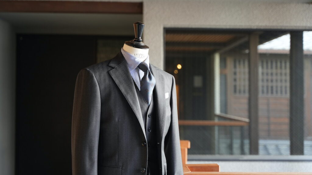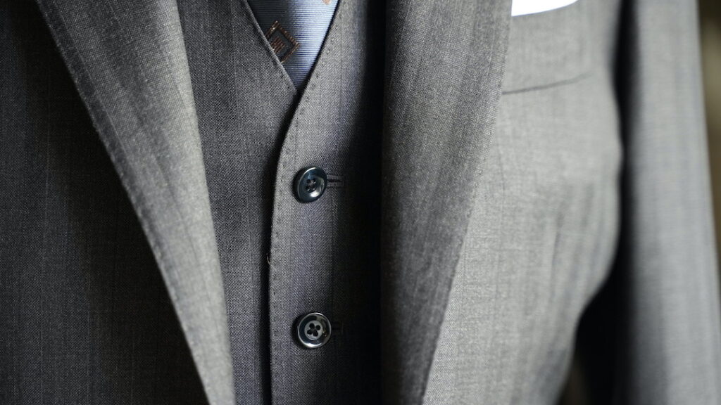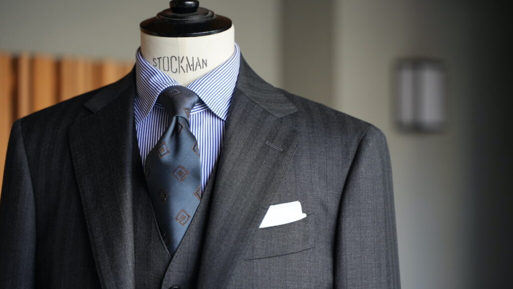 シングル3つボタン段返りのスリーピーススーツにてご注文いただきました。