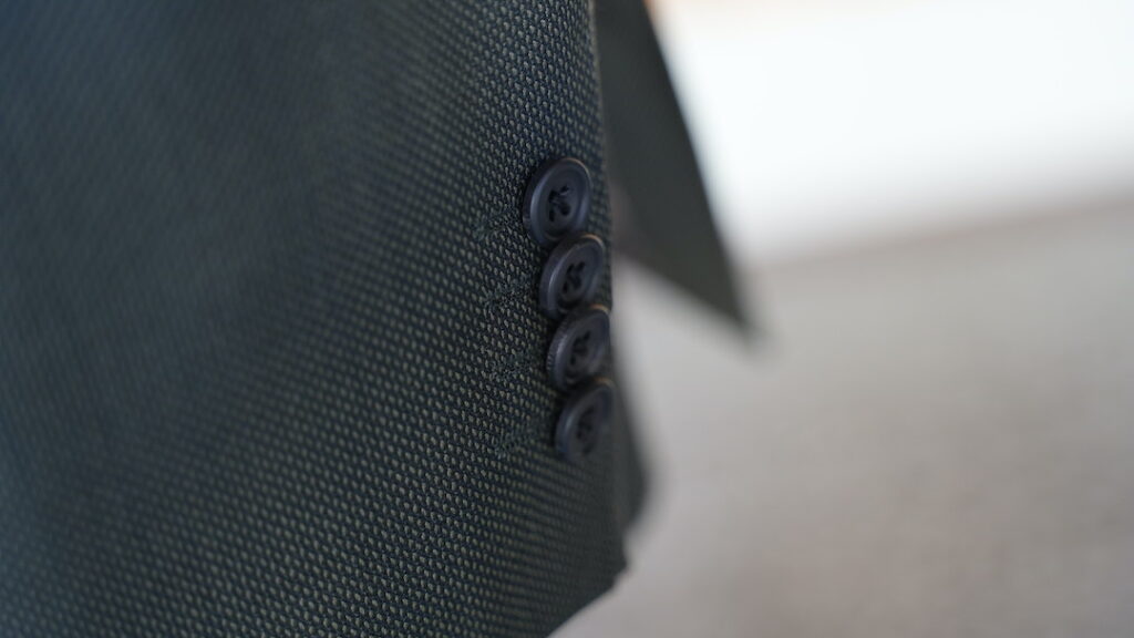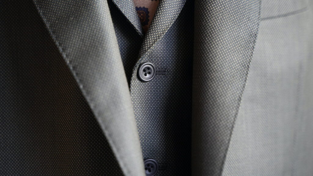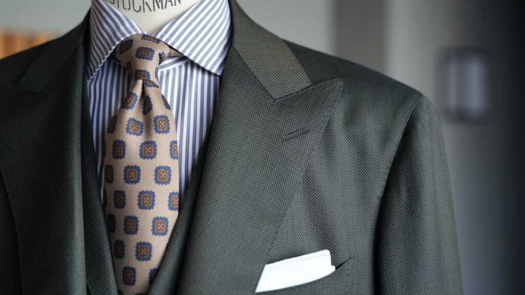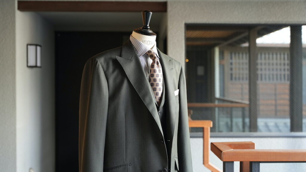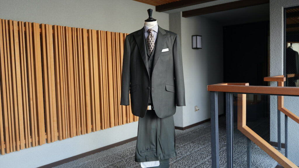 シングル2つボタンのスリーピーススーツにてご注文いただきました。